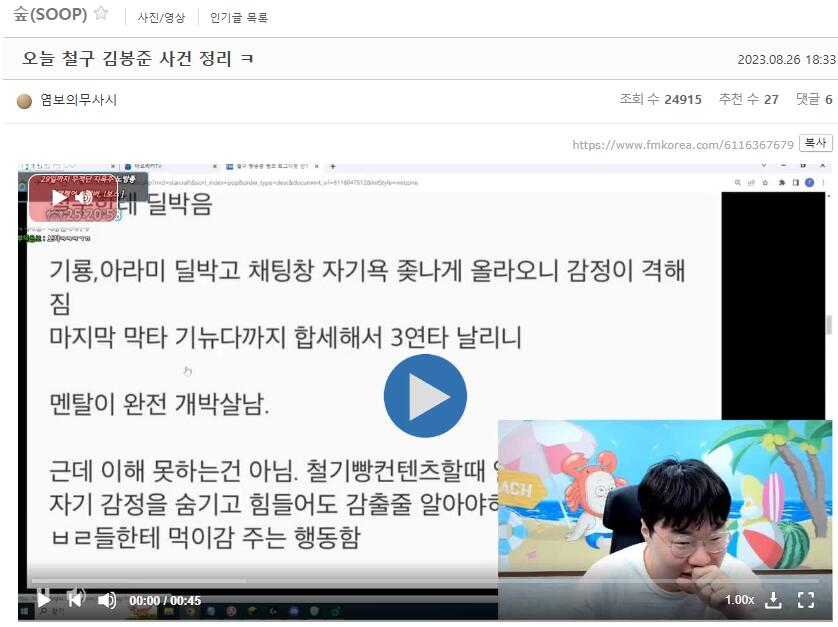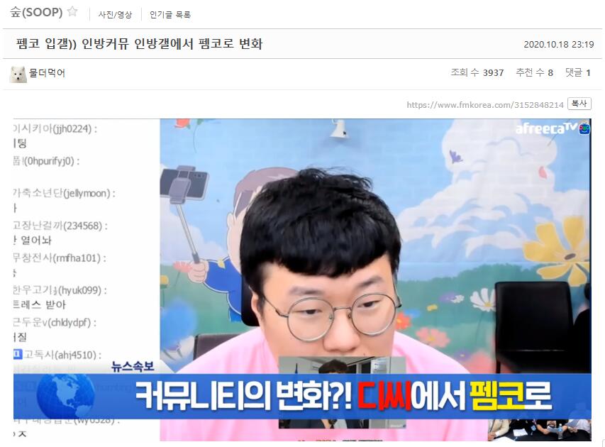 또한 인방 관련 담론도 활발합니다. 실제로 펨코 내에는 인방·스트리머 관련 게시판이 있으며, 방송 진행 중 발생한 이슈, 화제 영상, 시청자 반응 등이 빠르게 공유되고 있죠.