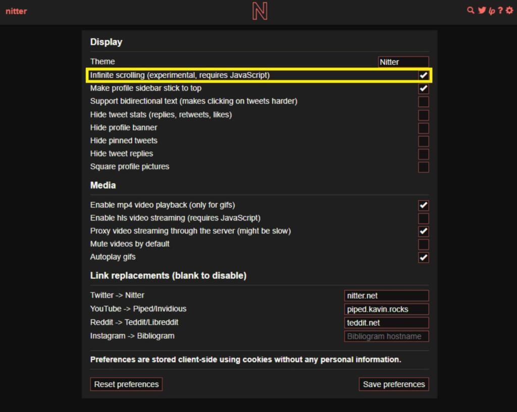 또한 Nitter 설정에서 Infinite scrolling 옵션을 활성화하면 스크롤 시 자동으로 트윗이 계속 로딩되어 사용성이 개선됩니다.