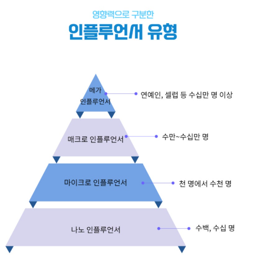 - 메가 인플루언서: 수십만~수백만 팔로워, 연예인급 영향력
